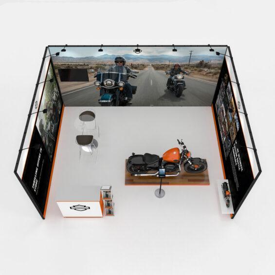Optional LED lighting attached to the top of the frames brightens up the stand and gets you noticed!  Add an optional counter with printed graphic for storage and something to work on and sit behind.